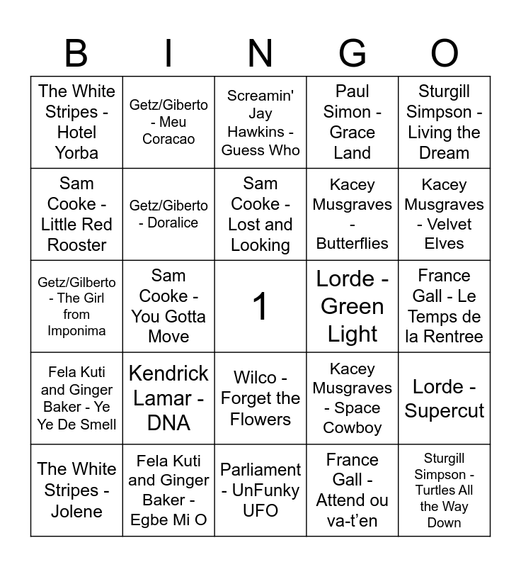 This bingo card has a free space and 75 words: Screamin’ Jay Hawkins - I put a spell on you, Screamin' Jay Hawkins - Please don’t leave me, Screamin' Jay Hawkins - Guess Who, Screamin' Jay Hawkins - What Good is It, Screamin' Jay Hawkins - Little Bitty Pretty One, David Bowe - Let’s Dance, David Bowie - Ricochet, David Bowie - Modern Love, David Bowie - Shake It, MF Doom - Hoe Cakes, MF Doom - One Beer, MF Doom - Rapp Snitch Kinishes, Sam Cooke - Lost and Looking, Sam Cooke - Little Red Rooster, Sam Cooke - Laughin and Clownin, Sam Cooke - You Gotta Move, Sam Cooke - Shake Rattle and Roll, Sturgill Simpson - Turtles All the Way Down, Sturgill Simpson - Life of Sin, Sturgill Simpson - Living the Dream, Sturgill Simpson - Long White Line, Getz/Gilberto - The Girl from Imponima, Getz/Giberto - Doralice, Getz/Giberto - Meu Coracao, Paul Simon - Grace Land, Paul Simon - Gum Boots, Paul Simon - Diamonds on the Souls of her Shoes, Paul Simon - You Can Call Me All, Paul Simon - That Was Your Mother, Kenny Rogers - The Gambler, Kenny Rogers - Making Music for Money, Kenny Rogers - Tennessee Bottle, Kacey Musgraves - Slow Burn, Kacey Musgraves - Space Cowboy, Kacey Musgraves - Velvet Elves, Kacey Musgraves - Butterflies, France Gall - Baby Pop, France Gall - Faut-Il Que Je T’aime, France Gall - Le Temps de la Rentree, France Gall - Attend ou va-t’en, Harry Belefonte - John Henry, Harry Belefonte - Day O, Harry Belefonte - Mama Look a Boo Boo, Harry Belefonte - Come Back Liza, The White Stripes - Fell in Love with a Girl, The White Stripes - Denial Twist, The White Stripes - Jolene, The White Stripes - Hotel Yorba, The White Stripes - Icky Thump, The White Stripes - My Doorbell, The White Stripes - Ball and a Buiscuit, Wilco - Forget the Flowers, Wilco - King Bin, Wilco - Some Day Soon, Wilco - Dreamer in my Dreams, Wilson Picket - In the Midnight Hour, Wilson Picket - 6345789, Wilson Picket - Mustang Sally, Wilson Picket - Funky Broadway, Wilson Picket - Soul Dance Number Three, Kendrick Lamar - DNA, Kendrick Lamar - Loyalty, Kendrick Lamar - Humble, Kendrick Lamar - XXX, Kendrick Lamar - Love, Lorde - Green Light, Lorde - Homemade Dynamite, Lorde - The Louvre, Lorde - Perfect Places, Lorde - Supercut, Fela Kuti and Ginger Baker - Ye Ye De Smell, Fela Kuti and Ginger Baker - Egbe Mi O, Parliament - Mothership Connection, Parliament - UnFunky UFO and Parliament - Handcuffs.