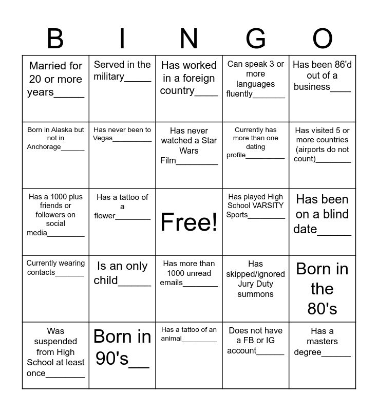 This bingo card has a free space and 24 words: Is an only child_____, Born in 90's__, Has never watched a Star Wars Film_________, Was suspended from High School at least once________, Has been 86'd out of a business____, Married for 20 or more years_____, Born in Alaska but not in Anchorage______, Served in the military_____, Has played High School VARSITY Sports_________, Has more than 1000 unread emails________, Currently has more than one dating profile__________, Has a 1000 plus friends or followers on social media_________, Has skipped/ignored Jury Duty summons, Born in the 80's, Has never been to Vegas__________, Does not have a FB or IG account______, Has been on a blind date_____, Has worked in a foreign country____, Has visited 5 or more countries (airports do not count)________, Has a tattoo of a flower________, Has a masters degree______, Currently wearing contacts_______, Can speak 3 or more languages fluently_______ and Has a tattoo of an animal_________.
