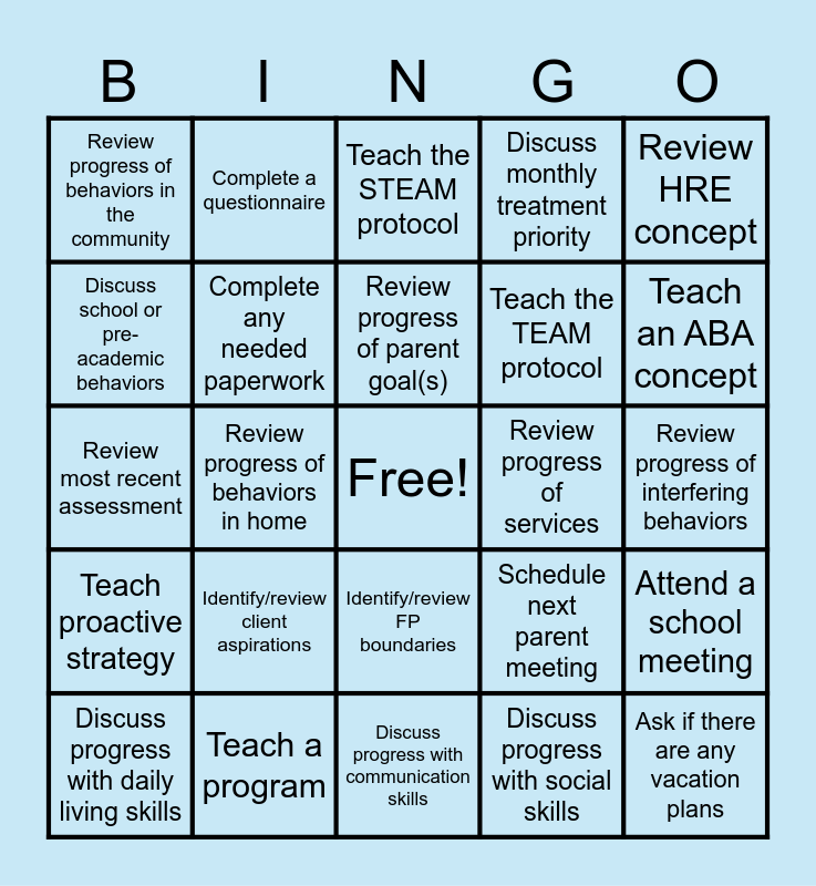 This bingo card has a free space and 24 words: Identify/review client aspirations, Teach a program, Review progress of parent goal(s), Discuss progress with daily living skills, Review HRE concept, Review progress of behaviors in the community, Discuss school or pre-academic behaviors, Complete a questionnaire, Review progress of services, Identify/review FP boundaries, Teach the TEAM protocol, Review most recent assessment, Schedule next parent meeting, Attend a school meeting, Complete any needed paperwork, Discuss progress with social skills, Review progress of interfering behaviors, Teach the STEAM protocol, Teach an ABA concept, Review progress of behaviors in home, Ask if there are any vacation plans, Teach proactive strategy, Discuss monthly treatment priority and Discuss progress with communication skills.