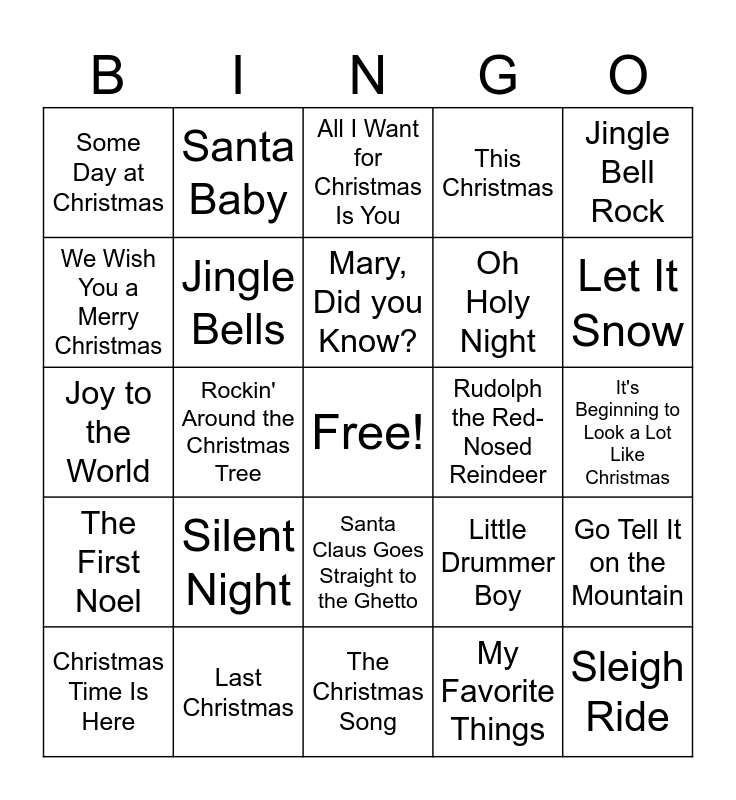 This bingo card has a free space and 29 words: Christmas Time Is Here, Santa Claus Is ComingTo Town, Rockin' Around the Christmas Tree, White Christmas, Some Day at Christmas, All I Want for Christmas Is You, Jingle Bells, Silent Night, Rudolph the Red-Nosed Reindeer, Last Christmas, It's Beginning to Look a Lot Like Christmas, Sleigh Ride, The Christmas Song, My Favorite Things, Let It Snow, Santa Claus Is Coming to Town, Santa Claus Goes Straight to the Ghetto, The First Noel, Jingle Bell Rock, Joy to the World, Little Drummer Boy, Every Year, Every Christmas, Oh Holy Night, We Wish You a Merry Christmas, This Christmas, Santa Baby, Go Tell It on the Mountain, Mary, Did you Know? and Do You Hear What I Here.