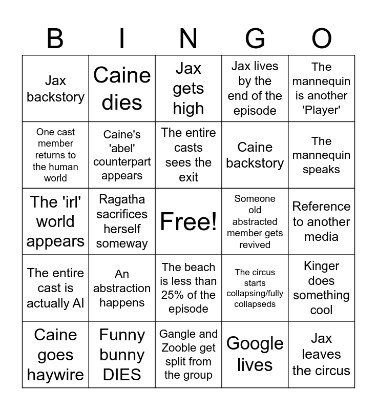 This bingo card has a free space and 24 words: An abstraction happens, Funny bunny DIES, The entire casts sees the exit, Caine goes haywire, The mannequin is another 'Player', Jax backstory, One cast member returns to the human world, Caine dies, Someone old abstracted member gets revived, The beach is less than 25% of the episode, Caine backstory, The 'irl' world appears, The circus starts collapsing/fully collapseds, Kinger does something cool, Caine's 'abel' counterpart appears, Google lives, Reference to another media, Jax gets high, The mannequin speaks, Ragatha sacrifices herself someway, Jax leaves the circus, The entire cast is actually AI, Jax lives by the end of the episode and Gangle and Zooble get split from the group.