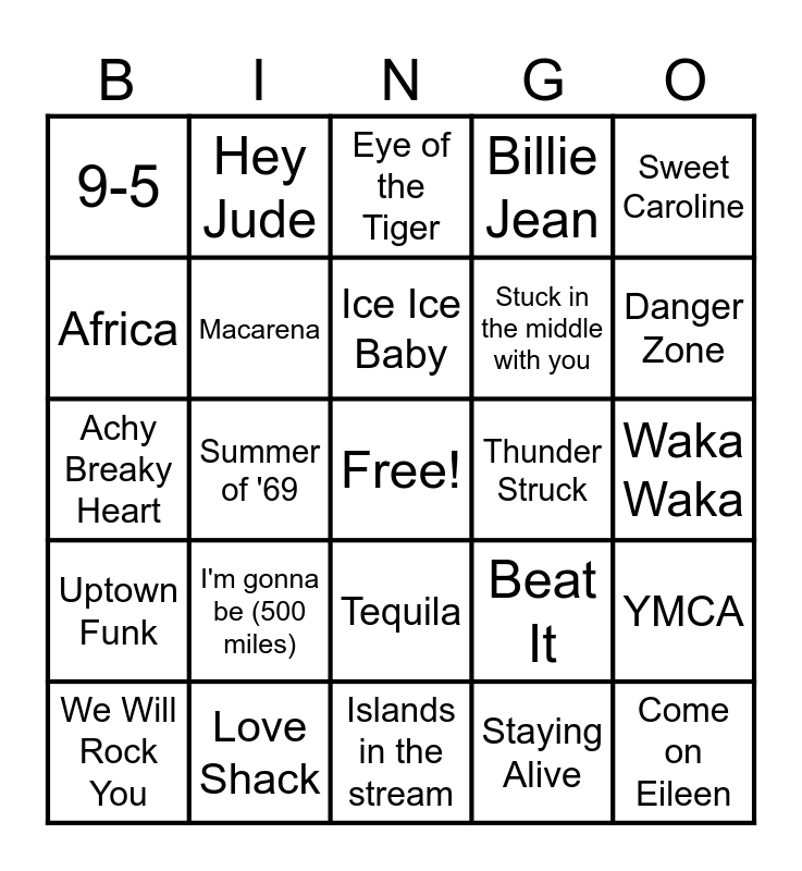 This bingo card has a free space and 25 words: I'm gonna be (500 miles), Islands in the stream, Ice Ice Baby, We Will Rock You, Sweet Caroline, 9-5, Africa, Hey Jude, Thunder Struck, Tequila, Stuck in the middle with you, Achy Breaky Heart, Beat It, YMCA, Macarena, La Isla Bonita, Waka Waka, Eye of the Tiger, Danger Zone, Summer of '69, Come on Eileen, Love Shack, Uptown Funk, Billie Jean and Staying Alive.