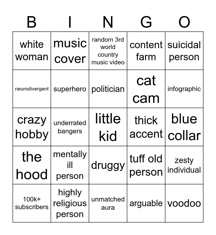 This bingo card has a free space and 24 words: mentally ill person, highly religious person, politician, 100k+ subscribers, suicidal person, white woman, neurodivergent, music cover, thick accent, druggy, cat cam, crazy hobby, tuff old person, zesty individual, superhero, arguable, blue collar, random 3rd world country music video, infographic, underrated bangers, voodoo, the hood, content farm and unmatched aura.