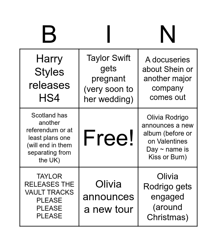 This bingo card has a free space and 8 words: Olivia Rodrigo announces a new album (before or on Valentines Day ~ name is Kiss or Burn), A docuseries about Shein or another major company comes out, Taylor Swift gets pregnant (very soon to her wedding), TAYLOR RELEASES THE VAULT TRACKS PLEASE PLEASE PLEASE, Harry Styles releases HS4, Olivia Rodrigo gets engaged (around Christmas), Scotland has another referendum or at least plans one (will end in them separating from the UK) and Olivia announces a new tour.