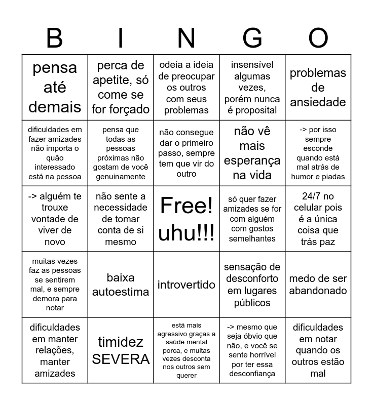 This bingo card has a free space and 24 words: baixa autoestima, timidez SEVERA, não consegue dar o primeiro passo, sempre tem que vir do outro, dificuldades em manter relações, manter amizades, problemas de ansiedade, pensa até demais, dificuldades em fazer amizades não importa o quão interessado está na pessoa, perca de apetite, só come se for forçado, só quer fazer amizades se for com alguém com gostos semelhantes, introvertido, não vê mais esperança na vida, -> alguém te trouxe vontade de viver de novo, sensação de desconforto em lugares públicos, medo de ser abandonado, pensa que todas as pessoas próximas não gostam de você genuinamente, -> mesmo que seja óbvio que não, e você se sente horrível por ter essa desconfiança, 24/7 no celular pois é a única coisa que trás paz, odeia a ideia de preocupar os outros com seus problemas, -> por isso sempre esconde quando está mal atrás de humor e piadas, não sente a necessidade de tomar conta de si mesmo, dificuldades em notar quando os outros estão mal, muitas vezes faz as pessoas se sentirem mal, e sempre demora para notar, insensível algumas vezes, porém nunca é proposital and está mais agressivo graças a saúde mental porca, e muitas vezes desconta nos outros sem querer.