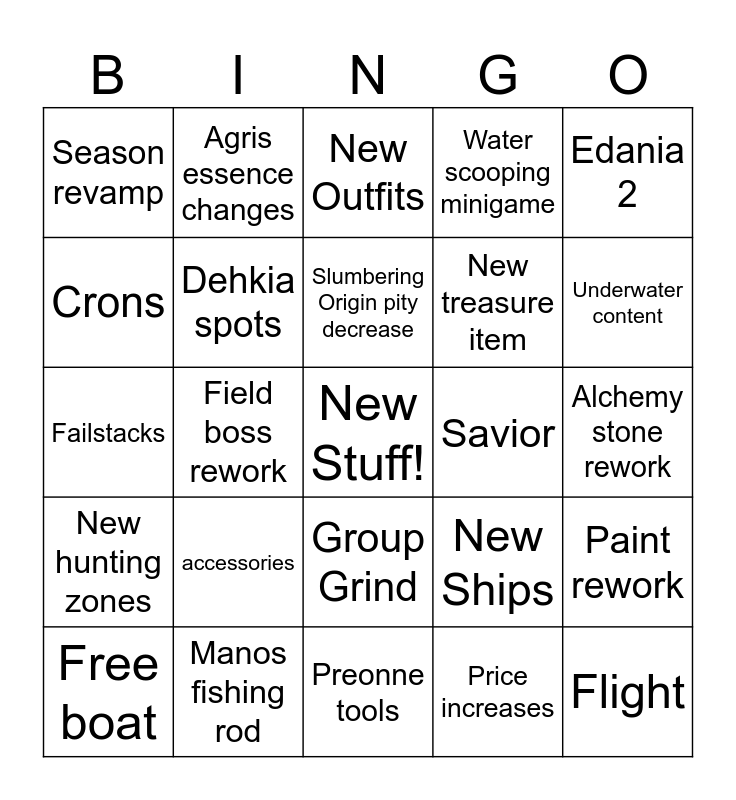 This bingo card has a free space and 24 words: accessories, Manos fishing rod, Slumbering Origin pity decrease, Free boat, Edania 2, Season revamp, Crons, Agris essence changes, Savior, Group Grind, New treasure item, Failstacks, New Ships, Paint rework, Dehkia spots, Price increases, Alchemy stone rework, New Outfits, Underwater content, Field boss rework, Flight, New hunting zones, Water scooping minigame and Preonne tools.