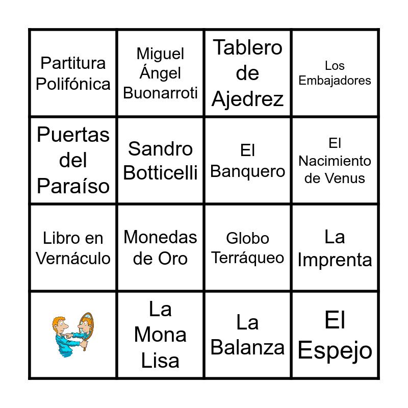 This bingo card has 2 images and 48 words: Leonardo da Vinci, Lorenzo de Médici, Nicolás Maquiavelo, Dante Alighieri, Miguel Ángel Buonarroti, Rafael Sanzio, Sandro Botticelli, Johannes Gutenberg, El Banquero, Los Embajadores, Hombre de Vitruvio, La Escuela de Atenas, El David, Manos de Adán, El Nacimiento de Venus, La Mona Lisa, Cúpula de Florencia, Puertas del Paraíso, La Imprenta, El Laúd, Partitura Polifónica, Libro en Vernáculo, Bloque de Mármol, Cincel y Martillo, Monedas de Oro, La Corona, Tablero de Ajedrez, Pluma y Tintero, Cráneo, Mapa de Italia, Ruinas Romanas, Arco de Medio Punto, Columna Corintia, Interior de Iglesia, Ciudad de Florencia, Punto de Fuga, Contrapposto, La Balanza, Manos Rezando, La Razón, Engranajes, Espiral Áurea, Máscara de Teatro, Globo Terráqueo, Flor de Lis, El Sol, El Espejo and Alfabeto Griego.