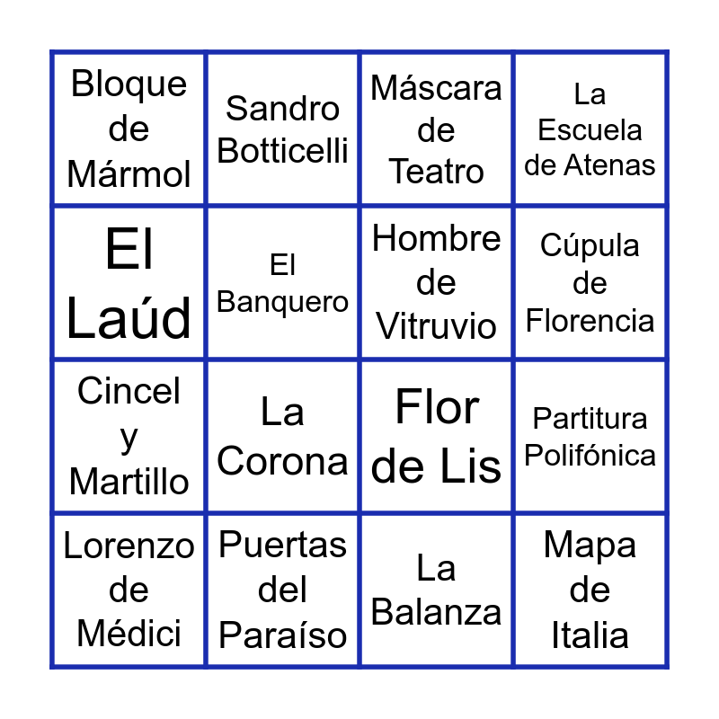 This bingo card has 48 words: Leonardo da Vinci, Lorenzo de Médici, Nicolás Maquiavelo, Dante Alighieri, Miguel Ángel Buonarroti, Rafael Sanzio, Sandro Botticelli, Johannes Gutenberg, El Banquero, Los Embajadores, Hombre de Vitruvio, La Escuela de Atenas, El David, Manos de Adán, El Nacimiento de Venus, La Mona Lisa, Cúpula de Florencia, Puertas del Paraíso, La Imprenta, El Laúd, Partitura Polifónica, Libro en Vernáculo, Bloque de Mármol, Cincel y Martillo, Monedas de Oro, La Corona, Tablero de Ajedrez, Pluma y Tintero, Cráneo, Mapa de Italia, Ruinas Romanas, Arco de Medio Punto, Columna Corintia, Interior de Iglesia, Ciudad de Florencia, Punto de Fuga, Contrapposto, La Balanza, Manos Rezando, La Razón, Engranajes, Espiral Áurea, Máscara de Teatro, Globo Terráqueo, Flor de Lis, El Sol, El Espejo and Alfabeto Griego.