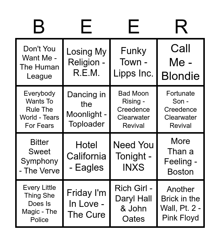 This bingo card has 59 words: December, 1963 - The Four Seasons, (I Just) Died In Your Arms - Cutting Crew, A Horse with No Name - America, George Martin, Another Brick in the Wall, Pt. 2 - Pink Floyd, Another One Bites The Dust - Queen, Are You Gonna Be My Girl - Jet, Bad Moon Rising - Creedence Clearwater Revival, Bette Davis Eyes - Kim Carnes, Bitter Sweet Symphony - The Verve, Born to Be Alive - Patrick Hernandez, Call Me - Blondie, Come On Eileen - Dexys Midnight Runner, Kevin Rowland, Dancing in the Moonlight - Toploader, Don't Bring Me Down - Electric Light Orchestra, Don't Dream It's Over - Crowded House, Don't You Want Me - The Human League, Every Little Thing She Does Is Magic - The Police, Everybody Wants To Rule The World - Tears For Fears, Everywhere - Fleetwood Mac, Fortunate Son - Creedence Clearwater Revival, Friday I'm In Love - The Cure, Funky Town - Lipps Inc., Gimme! Gimme! Gimme! - ABBA, Got My Mind Set on You - George Harrison, Happy Together - The Turtles, Have You Ever Seen The Rain - Creedence Clearwater Revival, Hold the Line - TOTO, Hooked On A Feeling - Blue Swede;Björn Skifs, Hotel California - Eagles, I Don't Feel Like Dancin' - Scissor Sisters, I Still Haven't Found What I'm Looking For - U2, I'm Like A Bird - Nelly Furtado, Kiss Me - Sixpence None The Richer, Let's Dance - David Bowie, Losing My Religion - R.E.M., Maniac - Michael Sembello, Message In A Bottle - The Police, More Than a Feeling - Boston, Mr. Blue Sky - Electric Light Orchestra, Need You Tonight - INXS, Old Time Rock & Roll - Bob Seger, Psycho Killer - Talking Heads, Rich Girl - Daryl Hall & John Oates, Rock the Casbah - The Clash, Roxanne - The Police, Should I Stay or Should I Go - The Clash, Shout - Tears For Fears, Signed, Sealed, Delivered - Stevie Wonder, Sultans Of Swing - Dire Straits, Sweet Home Alabama - Lynyrd Skynyrd, Take Me Out - Franz Ferdinand, The Power Of Love - Huey Lewis & The News, Time After Time - Cyndi Lauper, Uptown Girl - Billy Joel, We Didn't Start the Fire - Billy Joel, What's Up? - 4 Non Blondes, You Get What You Give - New Radicals, You Make Me Feel Like Dancing - Leo Sayer and You Make My Dreams (Come True) - Daryl Hall & John Oates.
