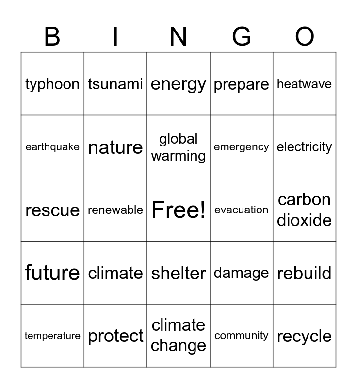 This bingo card has a free space and 25 words: climate, climate change, global warming, temperature, heatwave, typhoon, earthquake, tsunami, evacuation, shelter, emergency, rescue, damage, rebuild, nature, pollution, carbon dioxide, energy, electricity, renewable, recycle, protect, future, prepare and community.