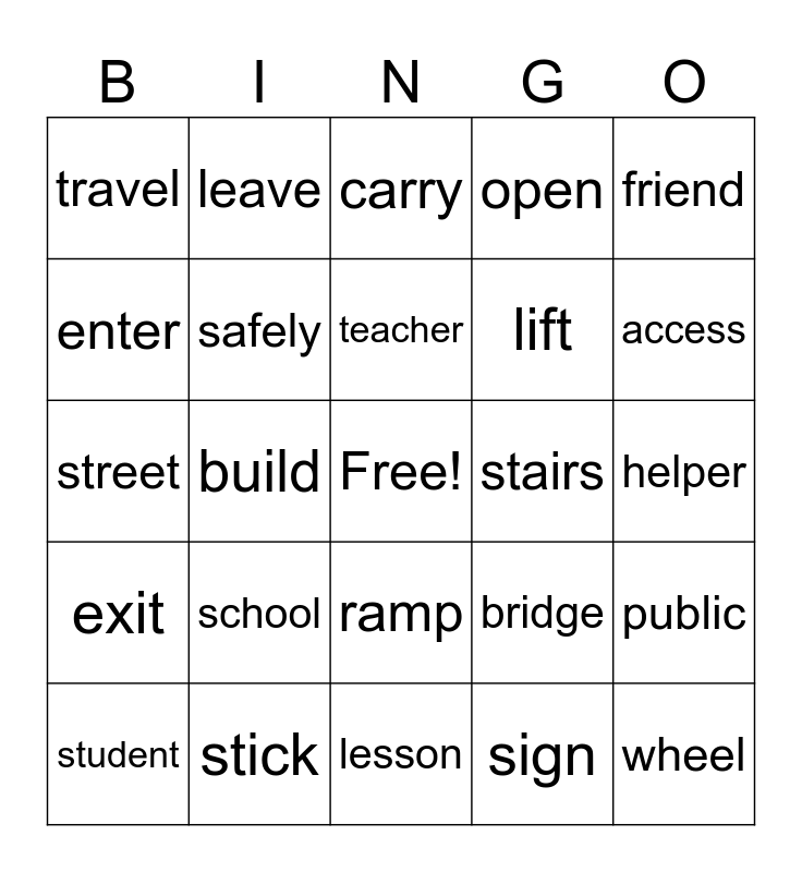 This bingo card has a free space and 25 words: school, lesson, teacher, student, friend, travel, enter, leave, stairs, ramp, lift, street, bridge, public, safely, family, helper, carry, access, build, wheel, stick, exit, open and sign.