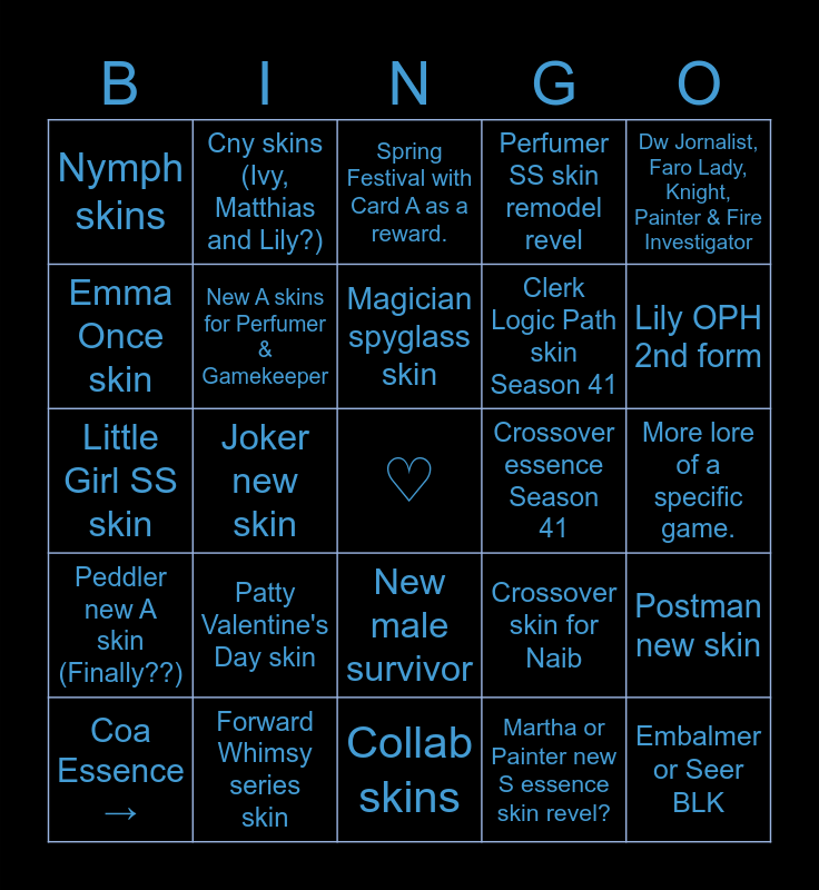 This bingo card has a free space and 24 words: Patty Valentine's Day skin, Forward Whimsy series skin, Magician spyglass skin, Coa Essence →, Dw Jornalist, Faro Lady, Knight, Painter & Fire Investigator, Nymph skins, Emma Once skin, Cny skins (Ivy, Matthias and Lily?), Crossover essence Season 41, New male survivor, Clerk Logic Path skin Season 41, Little Girl SS skin, Crossover skin for Naib, Postman new skin, New A skins for Perfumer & Gamekeeper, Martha or Painter new S essence skin revel?, More lore of a specific game., Spring Festival with Card A as a reward., Lily OPH 2nd form, Joker new skin, Embalmer or Seer BLK, Peddler new A skin (Finally??), Perfumer SS skin remodel revel and Collab skins.