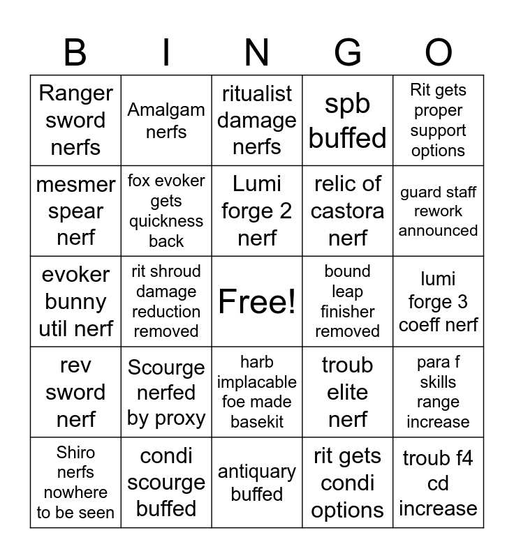 This bingo card has a free space and 24 words: Shiro nerfs nowhere to be seen, Scourge nerfed by proxy, Lumi forge 2 nerf, rit gets condi options, Rit gets proper support options, Ranger sword nerfs, Amalgam nerfs, ritualist damage nerfs, bound leap finisher removed, lumi forge 3 coeff nerf, evoker bunny util nerf, fox evoker gets quickness back, troub elite nerf, para f skills range increase, mesmer spear nerf, condi scourge buffed, antiquary buffed, spb buffed, guard staff rework announced, rev sword nerf, rit shroud damage reduction removed, harb implacable foe made basekit, relic of castora nerf and troub f4 cd increase.