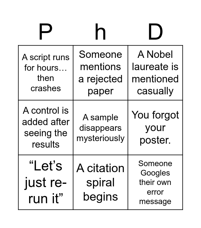 This bingo card has 60 words: “Reviewer 2 strikes again”, “It worked yesterday”, Coffee is treated as an essential reagent, Someone says “This should be easy” (it was not), A gel looks almost perfect, Code works on one computer only, “Let’s just re-run it”, A figure is remade five minutes before submission, Someone Googles their own error message, “We’ll explain it in the discussion”, A control is added after seeing the results, Someone spills something expensive, You forgot your poster., “It’s probably a batch effect”, An experiment fails for no clear reason, A script runs for hours… then crashes, Someone says “In theory, this should work”, A sample disappears mysteriously, “I swear this worked last week”, A citation spiral begins, A reference from 1973 is crucial, A Nobel laureate is mentioned casually, Someone spends five minutes looking for the right cable/adaptor, “Let’s check the supplementary”, A meeting could definitely have been an email, Someone says “Just one more experiment”, A reviewer asks for a totally new method, “We don’t really know why”, “The data are… moody today”, Someone reuses the same slide from last year, “The sample size is… limited”, A document crashes right before saving, A sentence starts with “In this context…”, A deadline quietly passes, Someone mentions a rejected paper, “This opens many new questions”, A PhD student explains the PI’s own project, A method only one person understands, Someone says “I’ll clean the data later”, A wet lab protocol says “mix gently”, A humanities PhD says “It depends”, Someone mentions ethics approval delays, A figure legend is longer than the figure, Someone says “It’s conceptually simple”, A PhD student wonders why a PhD sounded like a good idea, A freezer alarm goes off, “We’ll fix it in revision”, A theory works beautifully—experiment does not, Someone mentions imposter syndrome (indirectly), A footnote becomes essential, A PI says “Interesting…” (no follow-up), Someone accidentally deletes something important, “Let’s add it to future work”, A lab notebook entry starts with “I think…”, Someone says “This is interdisciplinary”, A paper is cited without being fully read, A title is changed at the last minute, Someone works on it “over the weekend”, A result is called “promising” and “At least it’s reproducible this time”.