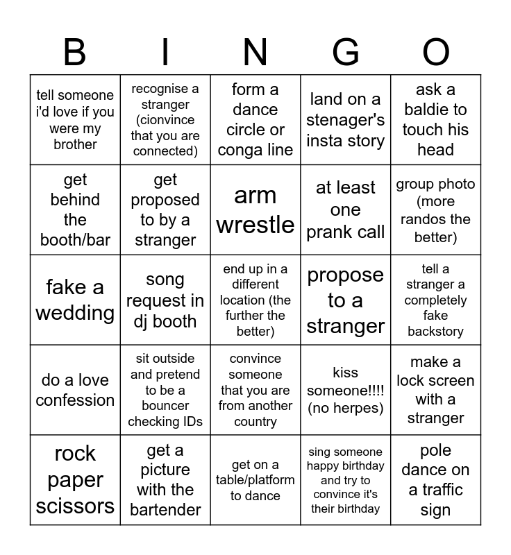This bingo card has 30 words: get a picture with the bartender, get a free drink, song request in dj booth, borrow a hat, tell someone i'd love if you were my brother, form a dance circle or conga line, get proposed to by a stranger, convince someone that you are from another country, propose to a stranger, get on a table/platform to dance, tell a stranger a completely fake backstory, end up in a different location (the further the better), sing someone happy birthday and try to convince it's their birthday, pole dance on a traffic sign, group photo (more randos the better), exchange a piece of clothing with a person of choice, kiss someone!!!! (no herpes), do a love confession, sit outside and pretend to be a bouncer checking IDs, ask a baldie to touch his head, fake a wedding, photobomb, recognise a stranger (cionvince that you are connected), at least one prank call, get behind the booth/bar, land on a stenager's insta story, make a lock screen with a stranger, rock paper scissors, arm wrestle and street interview someone.