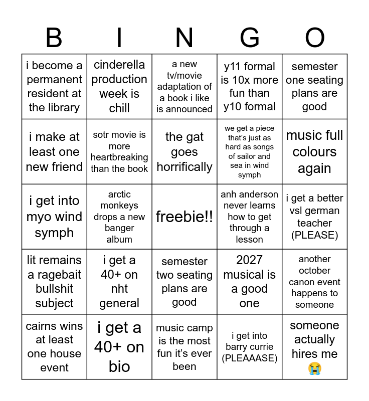 This bingo card has a free space and 24 words: i get a 40+ on nht general, i get a 40+ on bio, the gat goes horrifically, cairns wins at least one house event, semester one seating plans are good, i become a permanent resident at the library, i make at least one new friend, cinderella production week is chill, anh anderson never learns how to get through a lesson, semester two seating plans are good, we get a piece thatβs just as hard as songs of sailor and sea in wind symph, i get into myo wind symph, 2027 musical is a good one, another october canon event happens to someone, sotr movie is more heartbreaking than the book, i get into barry currie (PLEAAASE), i get a better vsl german teacher (PLEASE), a new tv/movie adaptation of a book i like is announced, music full colours again, arctic monkeys drops a new banger album, someone actually hires me π, lit remains a ragebait bullshit subject, y11 formal is 10x more fun than y10 formal and music camp is the most fun itβs ever been.