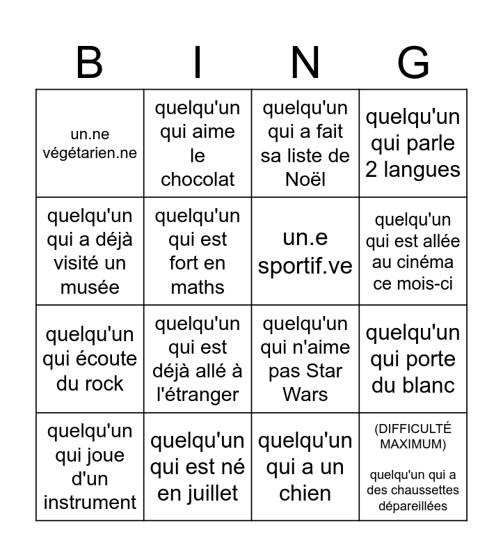 This bingo card has 16 words: quelqu'un qui est né en juillet, quelqu'un qui porte du blanc, quelqu'un qui a fait sa liste de Noël, un.ne végétarien.ne, quelqu'un qui écoute du rock, quelqu'un qui aime le chocolat, quelqu'un qui n'aime pas Star Wars, quelqu'un qui a un chien, quelqu'un qui a déjà visité un musée, quelqu'un qui est fort en maths, quelqu'un qui joue d'un instrument, quelqu'un qui parle 2 langues, quelqu'un qui est déjà allé à l'étranger, quelqu'un qui est allée au cinéma ce mois-ci, un.e sportif.ve and (DIFFICULTÉ MAXIMUM) quelqu'un qui a des chaussettes dépareillées.