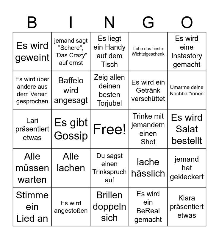 This bingo card has a free space and 29 words: Stimme ein Lied an, Jemand bestellt Sprudel, Es gibt Gossip, Es gibt streit um eine Sonnenbrille, Es wird geweint, Es liegt ein Handy auf dem Tisch, Baffelo wird angesagt, Alle lachen, Trinke mit jemandem einen Shot, Es wird angestoßen, Es wird Salat bestellt, Klara präsentiert etwas, Brillen doppeln sich, Es wird ein BeReal gemacht, Umarme deine Nachbar*innen, Jakob präsentiert etwas, Du sagst einen Trinkspruch auf, Alle müssen warten, Es wird eine Instastory gemacht, Lari präsentiert etwas, lache hässlich, gib der jüngsten eine Aufgabe, Es wird ein Getränk verschüttet, Es wird über andere aus dem Verein gesprochen, Lobe das beste Wichtelgeschenk, jemand sagt "Schere", "Das Crazy" auf ernst, jemand hat gekleckert, Zeig allen deinen besten Torjubel and Mach mindestens 3 Personen ein Kompliment.