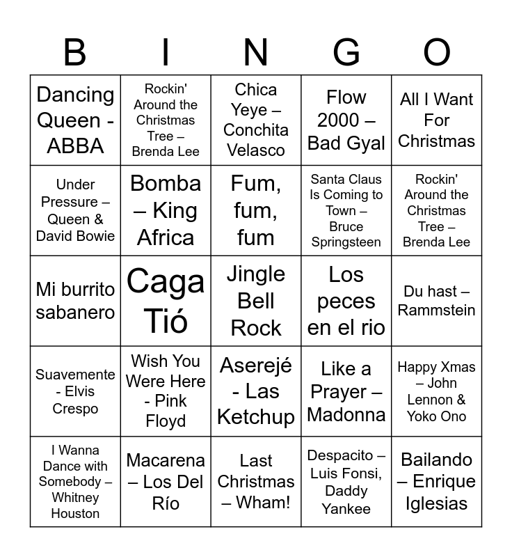 This bingo card has 40 words: Loba – Shakira, Mi burrito sabanero, Hacia Belen va Una Burra, Bomba – King Africa, Macarena – Los Del Río, Aserejé - Las Ketchup, Fum, fum, fum, Fireball - Pitbull, All I Want For Christmas, Suavemente - Elvis Crespo, Caga Tió, Flow 2000 – Bad Gyal, Jingle Bell Rock, Du hast – Rammstein, Los peces en el rio, Wish You Were Here - Pink Floyd, Feliz Navidad - José Feliciano, Dancing Queen - ABBA, Let it snow – Frank Sinatra, Chica Yeye – Conchita Velasco, Happy Xmas – John Lennon & Yoko Ono, Despacito – Luis Fonsi, Daddy Yankee, Santa Claus Is Coming to Town – Bruce Springsteen, Under Pressure – Queen & David Bowie, Campana sobre campana, El tamborilero – Raphael, Noche de paz, Livin’ on a Prayer – Bon Jovi, Bailando – Enrique Iglesias, Vivir mi vida – Marc Anthony, Waka Waka – Shakira, I Wanna Dance with Somebody – Whitney Houston, Stayin' Alive – Bee Gees, Like a Prayer – Madonna, Rockin' Around the Christmas Tree – Brenda Lee, Last Christmas – Wham!, Billie Jean – Michael Jackson, Let It Snow! Let It Snow! Let It Snow! – Dean Martin, Rockin' Around the Christmas Tree – Brenda Lee and Old Town Road – Lil Nas X ft. Billy Ray Cyrus.