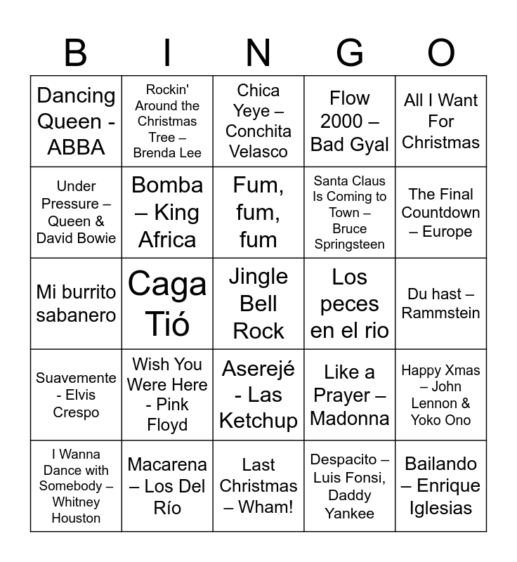 This bingo card has 40 words: Loba – Shakira, Mi burrito sabanero, Hacia Belen va Una Burra, Bomba – King Africa, Macarena – Los Del Río, Aserejé - Las Ketchup, Fum, fum, fum, Fireball - Pitbull, All I Want For Christmas, Suavemente - Elvis Crespo, Caga Tió, Flow 2000 – Bad Gyal, Jingle Bell Rock, Du hast – Rammstein, Los peces en el rio, Wish You Were Here - Pink Floyd, Feliz Navidad - José Feliciano, Dancing Queen - ABBA, Let it snow – Frank Sinatra, Chica Yeye – Conchita Velasco, Happy Xmas – John Lennon & Yoko Ono, Despacito – Luis Fonsi, Daddy Yankee, Santa Claus Is Coming to Town – Bruce Springsteen, Under Pressure – Queen & David Bowie, Campana sobre campana, El tamborilero – Raphael, Noche de paz, Livin’ on a Prayer – Bon Jovi, Bailando – Enrique Iglesias, Vivir mi vida – Marc Anthony, Waka Waka – Shakira, I Wanna Dance with Somebody – Whitney Houston, Stayin' Alive – Bee Gees, Like a Prayer – Madonna, The Final Countdown – Europe, Last Christmas – Wham!, Billie Jean – Michael Jackson, Let It Snow! Let It Snow! Let It Snow! – Dean Martin, Rockin' Around the Christmas Tree – Brenda Lee and Old Town Road – Lil Nas X ft. Billy Ray Cyrus.