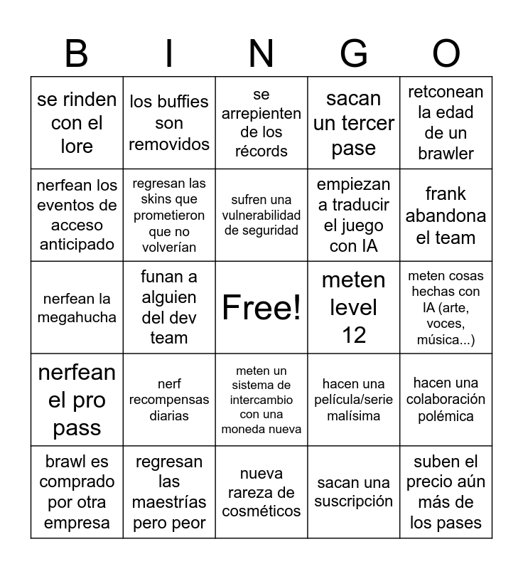 This bingo card has a free space and 24 words: nerf recompensas diarias, regresan las maestrías pero peor, sufren una vulnerabilidad de seguridad, brawl es comprado por otra empresa, retconean la edad de un brawler, se rinden con el lore, nerfean los eventos de acceso anticipado, los buffies son removidos, meten level 12, meten un sistema de intercambio con una moneda nueva, empiezan a traducir el juego con IA, nerfean la megahucha, hacen una película/serie malísima, hacen una colaboración polémica, regresan las skins que prometieron que no volverían, sacan una suscripción, meten cosas hechas con IA (arte, voces, música...), se arrepienten de los récords, frank abandona el team, funan a alguien del dev team, suben el precio aún más de los pases, nerfean el pro pass, sacan un tercer pase and nueva rareza de cosméticos.