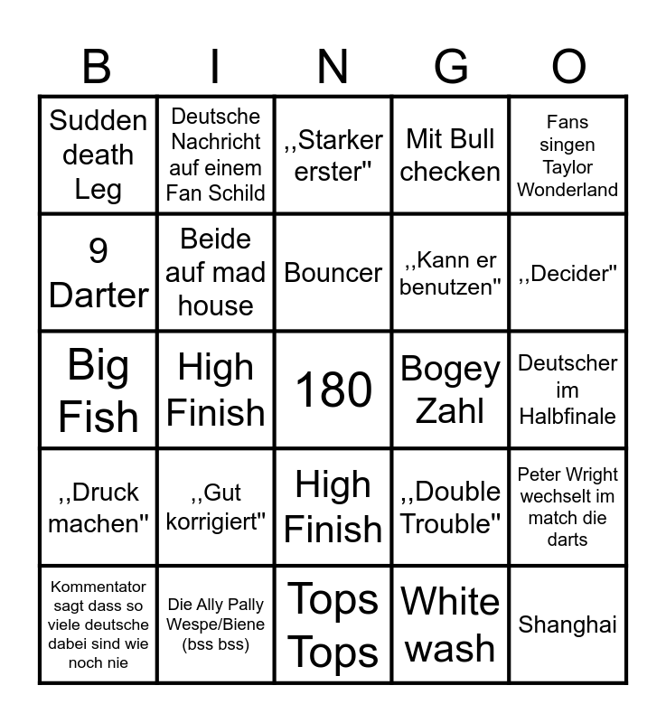 This bingo card has a free space and 24 words: ,,Gut korrigiert'', Die Ally Pally Wespe/Biene (bss bss), Bouncer, Kommentator sagt dass so viele deutsche dabei sind wie noch nie, Fans singen Taylor Wonderland, Sudden death Leg, 9 Darter, Deutsche Nachricht auf einem Fan Schild, Bogey Zahl, High Finish, ,,Kann er benutzen'', Big Fish, ,,Double Trouble'', Peter Wright wechselt im match die darts, Beide auf mad house, White wash, Deutscher im Halbfinale, ,,Starker erster'', ,,Decider'', High Finish, Shanghai, ,,Druck machen'', Mit Bull checken and Tops Tops.