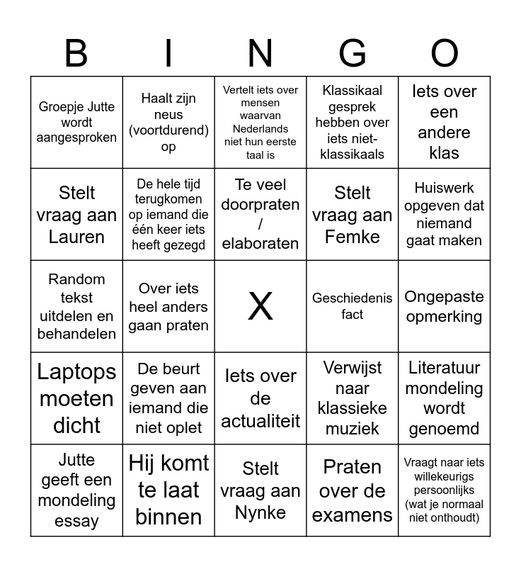This bingo card has a free space and 27 words: Verwijst naar klassieke muziek, Begint uit zichzelf op het bord te schrijven, Stelt vraag aan Femke, Stelt vraag aan Nynke, Stelt vraag aan Lauren, Vertelt iets over mensen waarvan Nederlands niet hun eerste taal is, Haalt zijn neus (voortdurend) op, Laptops moeten dicht, Geschiedenis fact, Literatuur mondeling wordt genoemd, Random tekst uitdelen en behandelen, Klassikaal gesprek hebben over iets niet-klassikaals, Jutte geeft een mondeling essay, Hij komt te laat binnen, Huiswerk opgeven dat niemand gaat maken, (Bijna) niemand let op, De hele tijd terugkomen op iemand die één keer iets heeft gezegd, Te veel doorpraten / elaboraten, De beurt geven aan iemand die niet oplet, Groepje Jutte wordt aangesproken, Ongepaste opmerking, Praten over de examens, Over iets heel anders gaan praten, Vraagt naar iets willekeurigs persoonlijks (wat je normaal niet onthoudt), Iets over de actualiteit, Iets over een andere klas and Heeft zijn sjaal om.