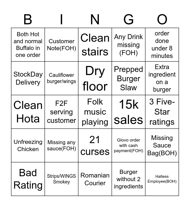 This bingo card has a free space and 24 words: Missing any sauce(FOH), Strips/WINGS Smokey, Dry floor, Bad Rating, order done under 8 minutes, Both Hot and normal Buffalo in one order, StockDay Delivery, Customer Note(FOH), 15k sales, 21 curses, Prepped Burger Slaw, Clean Hota, Glovo order with cash payment(FOH), Missing Sauce Bag(BOH), Cauliflower burger/wings, Burger without 2 ingredients, 3 Five-Star ratings, Clean stairs, Extra ingredient on a burger, F2F serving customer, Hatless Employee(BOH), Unfreezing Chicken, Any Drink missing (FOH) and Romanian Courier.