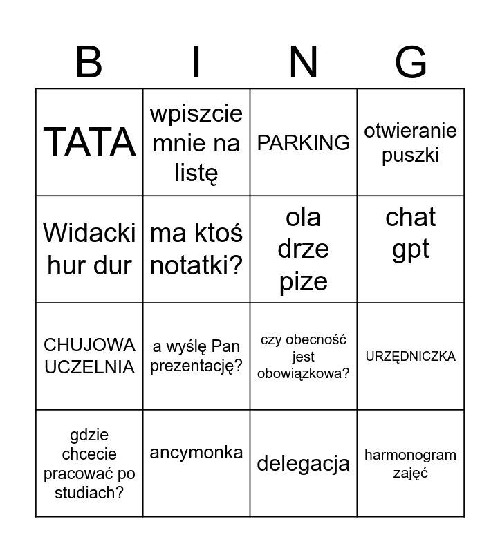 This bingo card has 16 words: ancymonka, URZĘDNICZKA, PARKING, TATA, CHUJOWA UCZELNIA, wpiszcie mnie na listę, czy obecność jest obowiązkowa?, delegacja, Widacki hur dur, ma ktoś notatki?, gdzie chcecie pracować po studiach?, otwieranie puszki, a wyślę Pan prezentację?, chat gpt, ola drze pize and harmonogram zajęć.