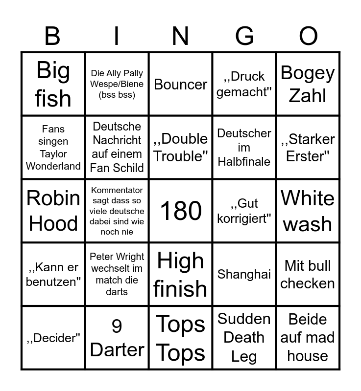 This bingo card has a free space and 24 words: Peter Wright wechselt im match die darts, 9 Darter, ,,Double Trouble'', ,,Decider'', Bogey Zahl, Big fish, Fans singen Taylor Wonderland, Die Ally Pally Wespe/Biene (bss bss), ,,Gut korrigiert'', High finish, Deutscher im Halbfinale, Robin Hood, Shanghai, Mit bull checken, Deutsche Nachricht auf einem Fan Schild, Sudden Death Leg, White wash, Bouncer, ,,Starker Erster'', Kommentator sagt dass so viele deutsche dabei sind wie noch nie, Beide auf mad house, ,,Kann er benutzen'', ,,Druck gemacht'' and Tops Tops.