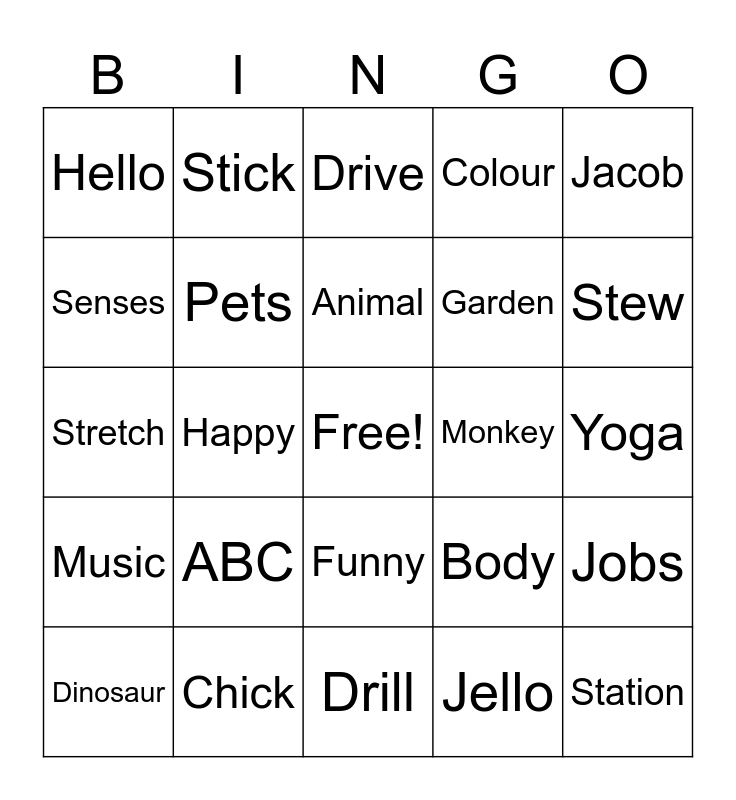 This bingo card has a free space and 39 words: School, Lunch, Happen, Pets, Dinosaur, Funny, Animal, Nap, Jacob, Music, Happy, Colour, Station, Yoga, Monkey, ABC, Teacher, Hello, Wave, Body, Senses, Drill, Garden, Stew, Winter, Tell, Thankful, Clean, Love, Stick, Birthday, Bunny, Drive, Chick, Jello, Head, Jobs, Stretch and Vehicle.