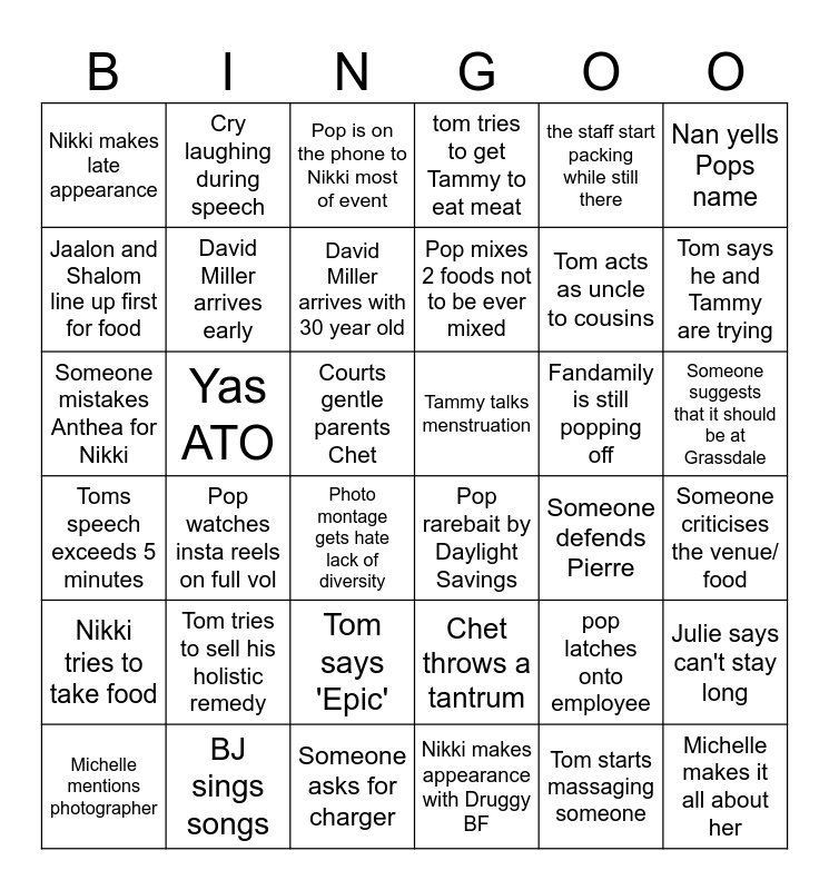 This bingo card has 36 words: Chet throws a tantrum, Tom says 'Epic', Nikki makes appearance with Druggy BF, Jaalon and Shalom line up first for food, Toms speech exceeds 5 minutes, Tammy talks menstruation, David Miller arrives early, Someone asks for charger, the staff start packing while still there, pop latches onto employee, Tom says he and Tammy are trying, tom tries to get Tammy to eat meat, Julie says can't stay long, Yas ATO, Pop mixes 2 foods not to be ever mixed, Nikki makes late appearance, Nikki tries to take food, Fandamily is still popping off, Someone mistakes Anthea for Nikki, Pop is on the phone to Nikki most of event, Courts gentle parents Chet, Pop watches insta reels on full vol, Pop rarebait by Daylight Savings, Photo montage gets hate lack of diversity, Someone defends Pierre, Cry laughing during speech, Tom acts as uncle to cousins, BJ sings songs, David Miller arrives with 30 year old, Nan yells Pops name, Michelle makes it all about her, Michelle mentions photographer, Someone criticises the venue/ food, Someone suggests that it should be at Grassdale, Tom tries to sell his holistic remedy and Tom starts massaging someone.