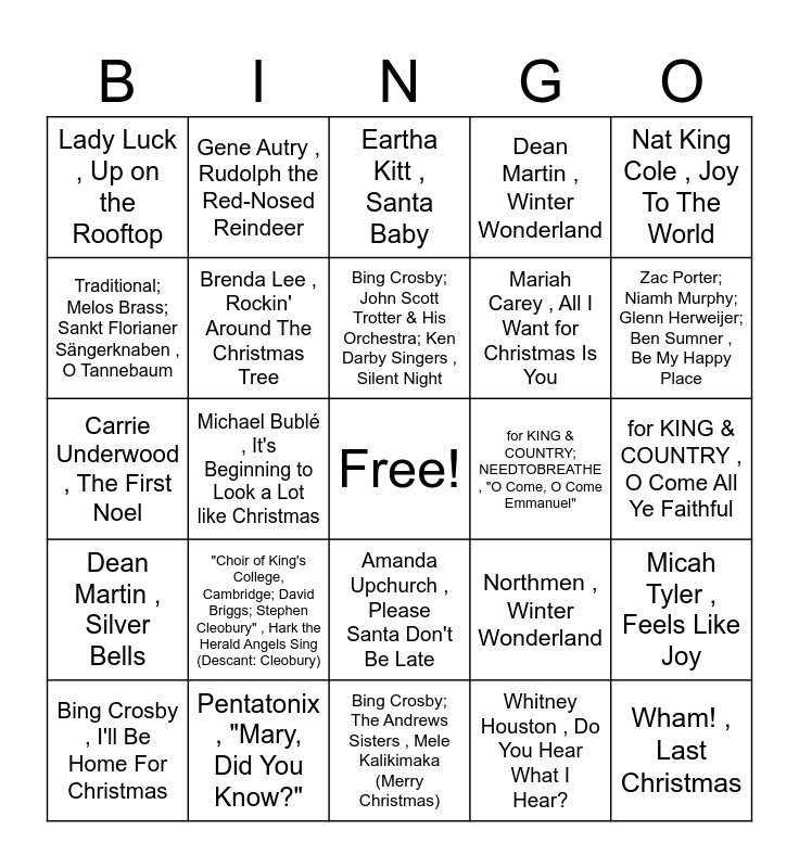 This bingo card has a free space and 73 words: Arist(s) Name,Track Name, Colin Paul , Its a Marshmallow World, Lady Luck , Up on the Rooftop, Chuck Berry , Run Rudolph Run, Anne Chmelewsky , Carol of the Bells, Andy Williams , It's the Most Wonderful Time of the Year, Dean Martin , Silver Bells, The Waitresses , Christmas Wrapping, Northmen , Winter Wonderland, Josh Groban , Believe, Trans-Siberian Orchestra , Christmas Eve / Sarajevo 12/24 - Instrumental; 2016 Remaster, Judy Garland , Have Yourself A Merry Little Christmas, Brenda Lee , Rockin' Around The Christmas Tree, for KING & COUNTRY , O Come All Ye Faithful, Forrest Frank , Deck The Halls, Gene Autry , Rudolph the Red-Nosed Reindeer, Bing Crosby; The Andrews Sisters , Mele Kalikimaka (Merry Christmas), Traditional; Melos Brass; Sankt Florianer Sängerknaben , O Tannebaum, Frank Sinatra; B. Swanson Quartet , Let It Snow! Let It Snow! Let It Snow! (with The B. Swanson Quartet), for KING & COUNTRY; NEEDTOBREATHE , "O Come, O Come Emmanuel", Bing Crosby; John Scott Trotter & His Orchestra; Ken Darby Singers , Silent Night, Dean Martin , Winter Wonderland, Nat King Cole , Joy To The World, Elton John , Step Into Christmas - Remastered 1995, Bing Crosby , I'll Be Home For Christmas, Sovereign Grace Music , "O Come, All You Unfaithful", Vince Guaraldi Trio , Christmas Time Is Here, Bing Crosby , The Little Drummer Boy - Remastered 2006, Bing Crosby; Ken Darby Singers; John Scott Trotter & His Orchestra , White Christmas - 1947 Version, The Jackson 5 , Santa Claus Is Coming To Town, Pentatonix , "Mary, Did You Know?", Paul McCartney , Wonderful Christmastime - Edited Version / Remastered 2011, Kelly Clarkson , Underneath the Tree, John Lennon; Yoko Ono , Happy Xmas (War Is Over) - Remastered 2010, Michael Bublé , It's Beginning to Look a Lot like Christmas, Thurl Ravenscroft , "You're A Mean One, Mr. Grinch", The Ronettes , Sleigh Ride, Faith Hill , Where Are You Christmas - From "Dr. Seuss' How The Grinch Stole Christmas" Soundtrack, Wham! , Last Christmas, Céline Dion , O Holy Night, Whitney Houston , Do You Hear What I Hear?, "Choir of King's College, Cambridge; David Briggs; Stephen Cleobury" , Hark the Herald Angels Sing (Descant: Cleobury), Burl Ives , A Holly Jolly Christmas, Pentatonix , We Wish You A Merry Christmas, Justin Bieber , Mistletoe, Mariah Carey , All I Want for Christmas Is You, Eartha Kitt , Santa Baby, Frank Sinatra , Jingle Bells, Relient K , I Celebrate the Day, Carrie Underwood , The First Noel, Bing Crosby; David Bowie; London Symphony Orchestra , Peace On Earth / Little Drummer Boy - Medley, José Feliciano , Feliz Navidad, Dean Martin , "Baby, It's Cold Outside", Bobby Helms , Jingle Bell Rock, Brad Paisley , The Christmas Song (Chestnuts Roasting On An Open Fire), Taylor Swift , Christmas Tree Farm, Jeff Meegan; David Tobin; Mark Armstrong; Steve Memmolo , The Very Best Day This Year, Amanda Upchurch , Please Santa Don't Be Late, Jessica Byrd; Eliseo Borrero; Felipe Fraga; Josiel Perez; Yakub Immanuel Saputra , God Bless Ye Merry Gentlemen, Harbour Lights , Jing-a-Ling, The Paulette Sisters , Santa Got Stuck in the Chimney, Penny and the Shakes , The Holidays Are Comin', Jules Larson , Bring On The Cheer, Zac Porter; Niamh Murphy; Glenn Herweijer; Ben Sumner , Be My Happy Place, DC Fattz , Rudolph the Red Nosed Rain Deer, Michael & Jello , Suzy Snowflake, South German Philharmonic Orchestra , Dance Of The Sugar Plum Fairy from The Nutcracker Suite, Gina Borys; Jeremie Peters , I Caught a Snowflake, Micah Tyler , Feels Like Joy, Anne-Kathrin Dern , Can You Hear the Bells, El Canfin , Noël Noël, Relient K , Deck the Halls and Darlene Love , Christmas (Baby Please Come Home).