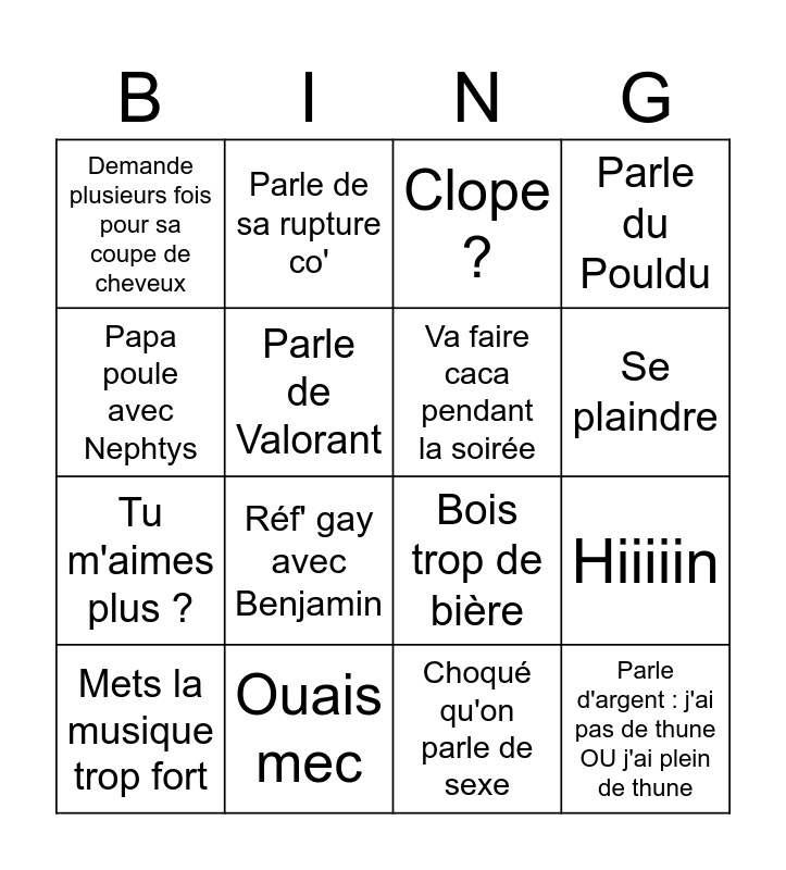 This bingo card has 16 words: Ouais mec, Hiiiiin, Clope ?, Demande plusieurs fois pour sa coupe de cheveux, Tu m'aimes plus ?, Parle de sa rupture co', Bois trop de bière, Choqué qu'on parle de sexe, Papa poule avec Nephtys, Parle de Valorant, Mets la musique trop fort, Parle du Pouldu, Réf' gay avec Benjamin, Se plaindre, Va faire caca pendant la soirée and Parle d'argent : j'ai pas de thune OU j'ai plein de thune.