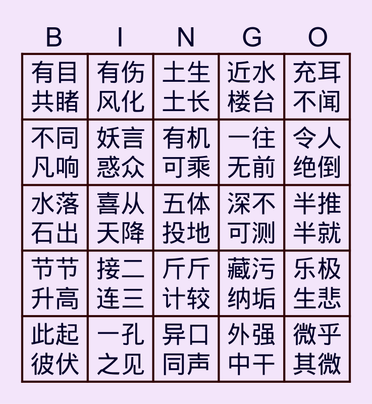 This bingo card has 25 words: 接二连三, 异口同声, 有机可乘, 此起彼伏, 充耳不闻, 有目共睹, 不同凡响, 有伤风化, 深不可测, 斤斤计较, 一往无前, 水落石出, 藏污纳垢, 乐极生悲, 妖言惑众, 微乎其微, 半推半就, 土生土长, 令人绝倒, 喜从天降, 五体投地, 一孔之见, 节节升高, 近水楼台 and 外强中干.