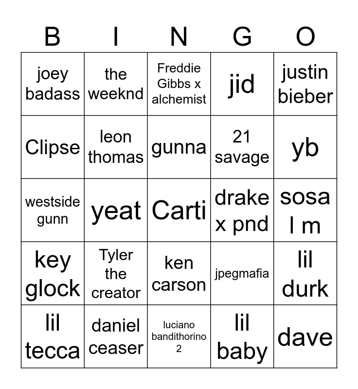 This bingo card has a free space and 24 words: Tyler the creator, daniel ceaser, gunna, lil tecca, justin bieber, joey badass, Clipse, the weeknd, drake x pnd, ken carson, 21 savage, westside gunn, jpegmafia, lil durk, leon thomas, lil baby, sosa l m, Freddie Gibbs x alchemist, yb, yeat, dave, key glock, jid and luciano bandithorino 2.