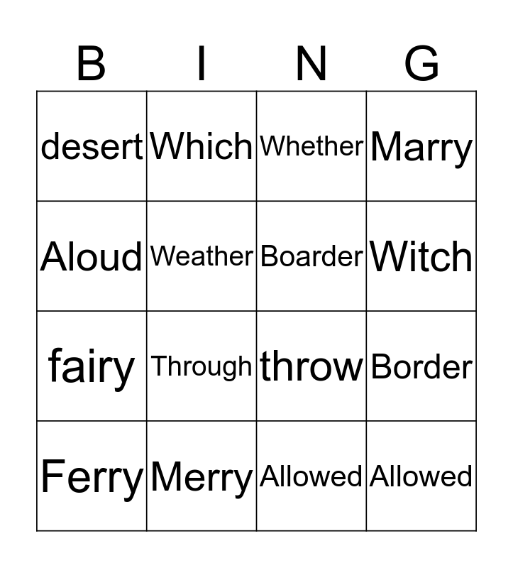 This bingo card has 16 words: Merry, Border, Whether, desert, fairy, Which, throw, Allowed, Aloud, Weather, Ferry, Marry, Through, Witch, Boarder and Allowed.