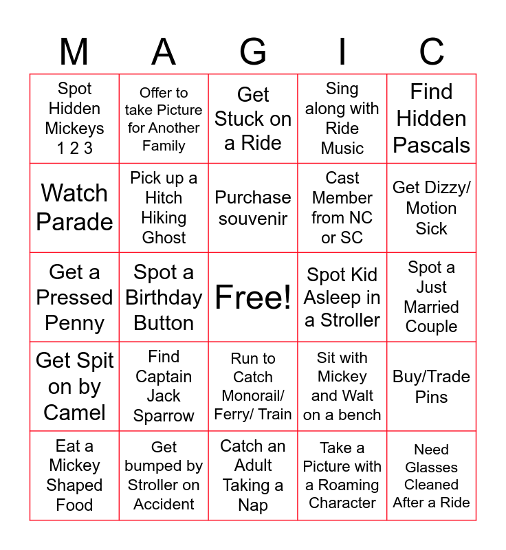 This bingo card has a free space and 29 words: Eat a Mickey Shaped Food, Spot a First Visit Button, Spot a Birthday Button, Spot a Lost Balloon, Spot Hidden Mickeys 1 2 3, Get Stuck on a Ride, Pick up a Hitch Hiking Ghost, Find Captain Jack Sparrow, Spot Kid Asleep in a Stroller, Get bumped by Stroller on Accident, Spot a Just Married Couple, Need Glasses Cleaned After a Ride, Catch an Adult Taking a Nap, Take a Picture with a Roaming Character, Get Dizzy/ Motion Sick, Get Caught in the Rain, Run to Catch Monorail/ Ferry/ Train, Get Spit on by Camel, Find Hidden Pascals, Get a Pressed Penny, Sit with Mickey and Walt on a bench, Take a Sad Picture in Front of a Closed Ride, Cast Member from NC or SC, Watch Parade, Sing along with Ride Music, Offer to take Picture for Another Family, Buy/Trade Pins, Purchase souvenir and Spotted a dropped Disney Snack.