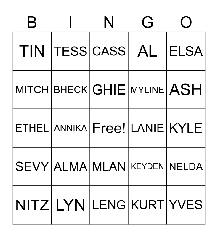 This bingo card has a free space and 24 words: ALMA, LYN, GHIE, NITZ, ELSA, TIN, MITCH, TESS, LANIE, MLAN, MYLINE, ETHEL, KEYDEN, NELDA, BHECK, KURT, KYLE, CASS, ASH, ANNIKA, YVES, SEVY, AL and LENG.