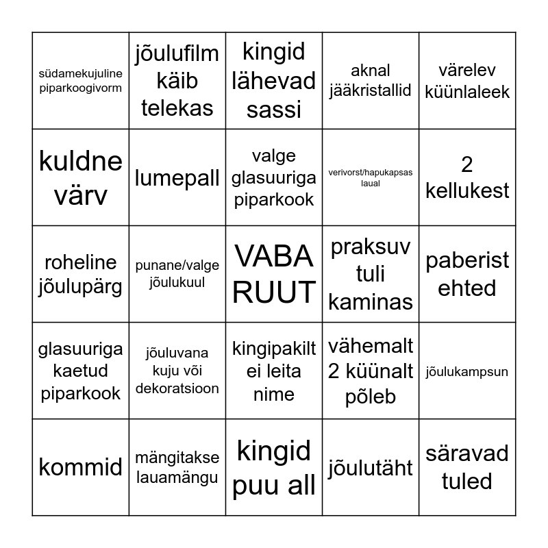 This bingo card has a free space and 50 words: jõulupuu, säravad tuled, jõulusokid kamina kohal, kingid puu all, jõuluvana kuju või dekoratsioon, keegi laulab jõululaule, jõulufilm käib telekas, pakkepaberi rebimise hääl, kuldne värv, inglikaunistus, lumepall, aknal jääkristallid, jõulukampsun, vähemalt 2 küünalt põleb, vilkuvad jõulukaunistused, pakkepaberi rebimise hääl, valge glasuuriga piparkook, praksuv tuli kaminas, keegi teeb jõuharjutusi kingi lunastamiseks, värelev küünlaleek, punane/valge jõulukuul, jõulutäht, südamekujuline piparkoogivorm, verivorst/hapukapsas laual, päkapikumüts, põhjapõder, 2 kellukest, sajab lund, kingid lähevad sassi, kingipakilt ei leita nime, keegi teeb kalli, pakkepaberit täis põrand, lumememm, kingi lunastus naljaga, mängitakse lauamängu, keegi üritab tähti näha, perepildi tegemine, jõulumuusika, piparkoogimaja, paberist ehted, vähemalt 3 jääpurikat, 2 mandariini/apelsini, kõrbenud piparkook, suss, kommid, roheline jõulupärg, luuletuse lugemine, jänesega luuletus, glasuuriga kaetud piparkook and kommipulk.