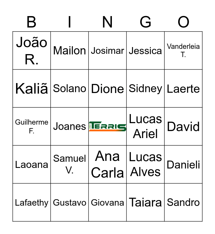 This bingo card has a free space and 89 words: Alexandre, Amanda, Ana Carla, Arthur, Aylton, Bruno C., Bruno de M., Bruno L., Cesar, Cristian, Daiana, Daniel, Danieli, David, Denis, Dione, Eduardo, Eliton, Emerson, Felipe, Gabriela, Gelvane, Giovana, Guilherme A., Guilherme F., Gustavo, Itacir, Italo, Jacir, James, Jessica, Joanes, João C., João R., Johélia, Josimar, Kaliã, Kelly, Laerte, Lafaethy, Laoana, Leandro, Leonardo B., Leonardo T., Lucas Alves, Lucas Ariel, Luiz Felipe F., Luiz Felipe Martins, Luiz Felipe Morais, Mailon, Marcio, Marcos, Maria R (Tania), Mariana, Mateus Pacassa, Matheus Possamai, Maycon, Michel, Michele, Nailson, Nara, Rafael, Rauany, Renata, Roberson, Rodrigo, Ryan, Salvador, Samuel B., Samuel V., Sandro, Sara P., Sara Z., Sidney, Solano, Taiara, Tatiane, Tiago, Valfrido, Vanderleia M., Vanderleia T., Vanessa, Wiliam P., Willian S., Mayara, Mateus M., Gabriel M., Tarcisio and Rudinei.