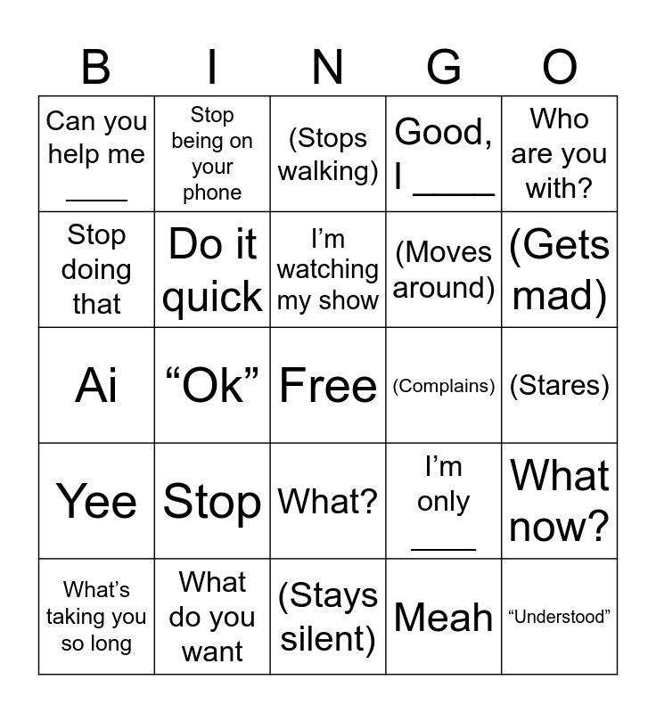 This bingo card has a free space and 24 words: Stop, What do you want, I’m watching my show, What’s taking you so long, Who are you with?, Can you help me ____, Stop doing that, Stop being on your phone, (Complains), What?, (Moves around), Ai, I’m only ____, What now?, Do it quick, Meah, (Stares), (Stops walking), (Gets mad), “Ok”, “Understood”, Yee, Good, I ____ and (Stays silent).