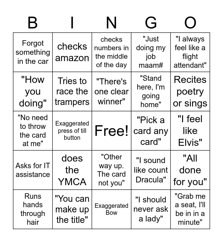 This bingo card has a free space and 34 words: "Well its dry in the car park", "I should never ask a lady", "I like your ____", "Did you have a good time", Asks for IT assistance, Tries to race the trampers, "I always feel like a flight attendant", Runs hands through hair, checks amazon, "Don't show me which one", "There's one clear winner", checks numbers in the middle of the day, Checks wreath of wreath votes, "I don't like to be a salesman", "Pick a card any card", Recites poetry or sings, "You can make up the title", "No need to throw the card at me", does the YMCA, "I sound like count Dracula", "Other way up. The card not you", "Treacle", Forgot something in the car, "I feel like Elvis", Exaggerated Bow, "Grab me a seat, I'll be in in a minute", "Just doing my job maam#, "Do you want me to scan it or are you", "Stand here, I'm going home", "How you doing", Presses scan card after scanning everyone, Exaggerated press of till button, "All done for you" and Rolls his eyes.