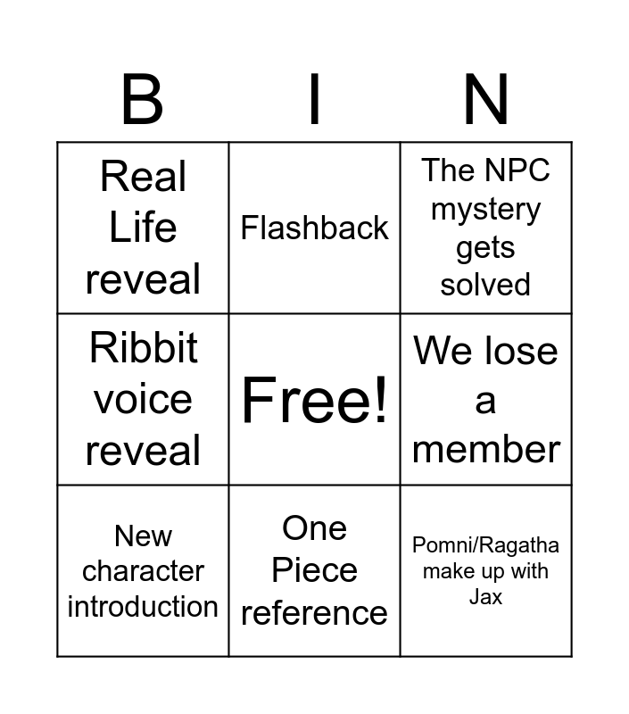 This bingo card has a free space and 8 words: We lose a member, The NPC mystery gets solved, Flashback, New character introduction, Real Life reveal, Pomni/Ragatha make up with Jax, Ribbit voice reveal and One Piece reference.