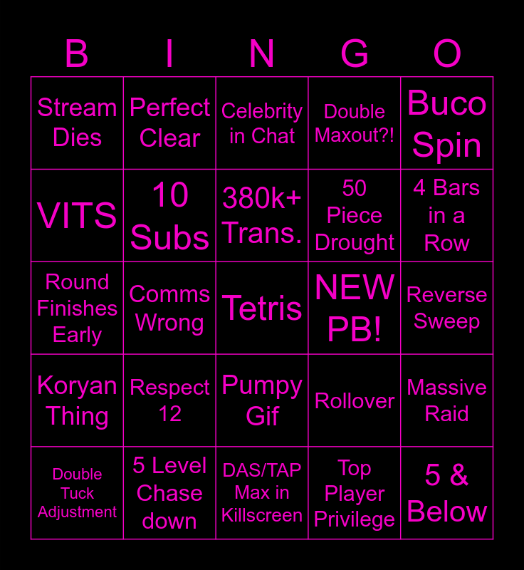 This bingo card has a free space and 24 words: Respect 12, 5 Level Chase down, 380k+ Trans., Double Tuck Adjustment, Buco Spin, Stream Dies, VITS, Perfect Clear, NEW PB!, Pumpy Gif, 50 Piece Drought, Round Finishes Early, Rollover, Massive Raid, 10 Subs, Top Player Privilege, Reverse Sweep, Celebrity in Chat, 4 Bars in a Row, Comms Wrong, 5 & Below, Koryan Thing, Double Maxout?! and DAS/TAP Max in Killscreen.