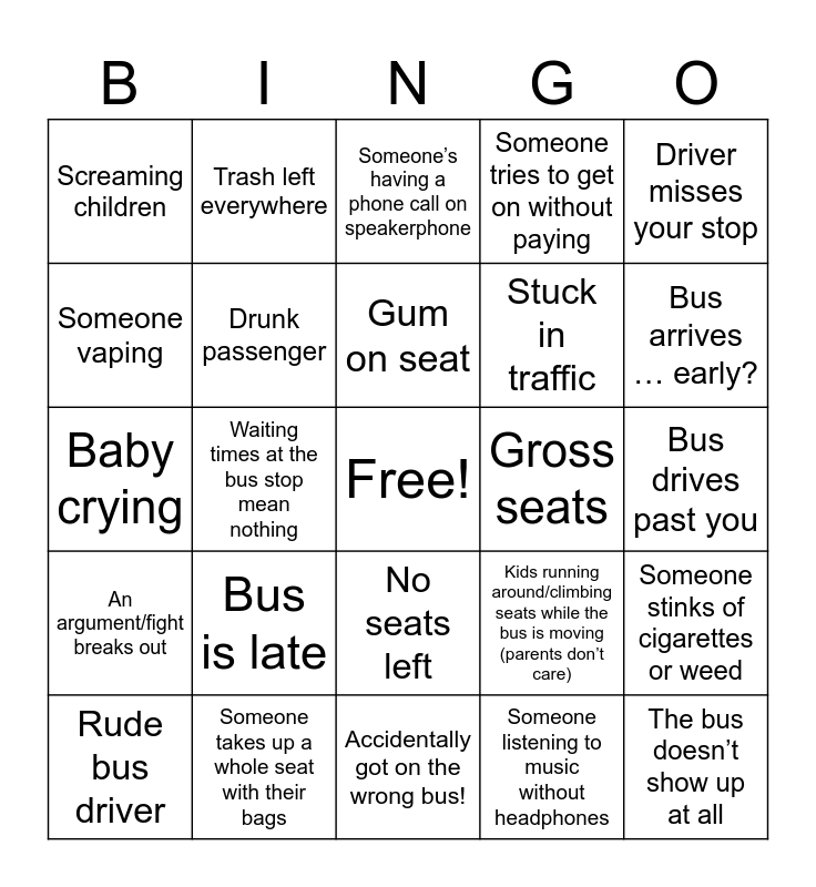 This bingo card has a free space and 24 words: Bus is late, Someone takes up a whole seat with their bags, Gum on seat, Rude bus driver, Driver misses your stop, Screaming children, Someone vaping, Trash left everywhere, Gross seats, No seats left, Stuck in traffic, Baby crying, Kids running around/climbing seats while the bus is moving (parents don’t care), Someone stinks of cigarettes or weed, Drunk passenger, Someone listening to music without headphones, Bus drives past you, Someone’s having a phone call on speakerphone, Bus arrives … early?, Waiting times at the bus stop mean nothing, The bus doesn’t show up at all, An argument/fight breaks out, Someone tries to get on without paying and Accidentally got on the wrong bus!.