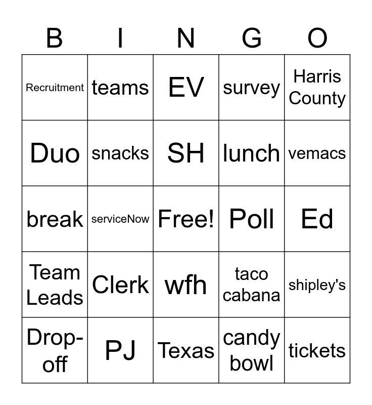 This bingo card has a free space and 24 words: Clerk, PJ, SH, Drop-off, Harris County, Recruitment, Duo, teams, Poll, wfh, lunch, break, taco cabana, shipley's, snacks, candy bowl, Ed, EV, vemacs, serviceNow, tickets, Team Leads, survey and Texas.