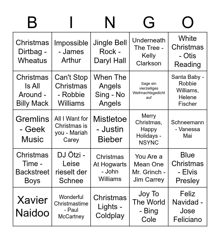 This bingo card has 108 words: Joker, Last Christmas -Wham, All I Want for Christmas is you - Mariah Carey, Merry Christmas Everyone - Shaking' Stevens, I Wish It Could Be Christmas Everyday - Wizzard, Driving Home For Christmas - Chris Rea, Do They Know It's Christmas? - Band Aid, Let It Snow!Let It Snow! - Dean Martin, Happy Xmas (War Is Over) - John Lennon, Santa Clause Is Coming To Town - The Crystals, The Little Drummer Boy - Stevie Wonder, Johns Lieblingsweihnachtslied (wer hat letztes Jahr zugehört?:-)), I Dreamed a Dream - Susan Boyle, Wonderful Dream - Melanie Thornton, Somethin' Stupid - Robbie Williams, Nicole Kidman, An Angel - The Kelly Family, Impossible - James Arthur, Jump - The Pointer Sisters, All You Need Is Love - The Beatles, Kelly Family - We wish you a merry Christmas, DJ Ötzi - Leise rieselt der Schnee, The Trouble With Love is - Kelly Clarkson, God Only Knows - The Beach Boys, Too Lost in You - Sugababes, Glasgow Love Theme - Craig Armstrong, White Christmas - Otis Reading, Christmas Is All Around - Billy Mack, Underneath The Tree -Kelly Clarkson, It's Beginning To Look a Lot Like Christmas - Michael Buble, Snowman - Sia, Feliz Navidad - Jose Feliciano, Wonderful Christmastime - Paul McCartney, Merry Christmas - Ed Sheeran, Elton John, Christmas Without You - Ava Max, Thank God It's Christmas - Queen, Jingle Bell Rock - Daryl Hall, Santa Can't You Hear Me - Kelly Clarkson, Christmas Time - Bryan Adams, My Only Wish - Britney Spears, Mistletoe - Justin Bieber, Winter Wunderland - Leona Lewis, Hallelujah - Pentatonix, Christmas Lights - Coldplay, Jeden Tag Weihnachten - Wincent Weiss, Santa Baby - Kylie Minogue, Can't Stop Christmas - Robbie Williams, Merry XMas Everyone - Slide, When The Angels Sing - No Angels, All I Want For Christmas - Liam Payne, Merry Christmas, Happy Holidays - NSYNC, All I Want For Christmas - Hurts, Santa Baby - Robbie Williams, Helene Fischer, Christmas Time - Backstreet Boys, Here For Christmas - Lukas Graham, Carol of the Bells - Lena, One Wish - Whitney Houston, Stille Nacht, heilige Nacht - Gregor Meyle, Fröhliche Weihnachten überall - Helene Fischer, Nicht die „Toten Hosen“, Christmas Dirtbag - Wheatus, Erzähle von deinem besten Weihnachtsgeschenk in deinem, Love Actually, Feels Like Christmas - SVEA, In der Weihnachtsbäckerei - Rolf Zuckowski, The Chipmunk Song - Alvin & The Chipmunks, Winter Wonderland - Eurythmics, Christmas in Hollis - Run DMC, Blue Christmas - Elvis Presley, We Wish You a Merry Christmas - John Williams, You Are a Mean One Mr. Grinch - Jim Carrey, Christmas At Hogwarts - John Williams, Gremlins - Geek Music, Joy To The World - Bing Cole, Die Hard 2, Der kleine Lord, Drei Haselnüsse für Aschenbrödel, Believe - Josh Groban, Maestro - Hans Zimmer, Der perfekte Weihnachtsmoment - Max Raabe, Weihnachtssong - Sido, Frohe Weihnachten - Finch, Der Baron von Grinchhausen - Nena, Samy Deluxe, Holz-Weihnachtslied - 257ers, Yolohafte Swagnachten - Money Boy, Ich hab kein Feuerzeug - SXTN, Diese Serie war letztes Jahr Basis der Edeka Werbung, Euer Team trinkt gemeinsam einen Shot, Euer Team überlegt sich ein Sieger-Handshake, Halte eine 1min Laudatio auf Kekse deiner Wahl, Winter in Berlin - Juju, Male einer Person ein Weihnachtstattoo, Sage ein vierzeiliges Weihnachtsgedicht auf, Baue mit deinem Team ein Kartenhaus aus 7 Karten(klassisches Model), Schreibe Felix ein Keksrezept auf und erkläre es ihm, Winter Wonderland - Snoop Dogg, Anna Kendrick, Merry Christmas Everyone - Lenny, VIZE, Christmas Tree Farm - Taylor Swift, Xavier Naidoo, Weihnachten bin ich zu Haus - Fischer Chöre, DJ Play a Christmas Song - Cher, Your Christmas - Tokio Hotel, Schneeflöckchen, Weissröcken - Rolf Zuckowski, O Tannenbaum - Simone Sommerland, Jingle Bell Rock - Bobby Helms, Rocking' Around the Christmas Tree - B.Lee, Sasha, Schneemann - Vanessa Mai and Home Alone.