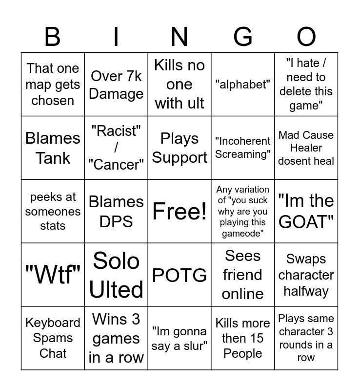 This bingo card has a free space and 24 words: Solo Ulted, Wins 3 games in a row, Plays Support, Keyboard Spams Chat, "I hate / need to delete this game", That one map gets chosen, Blames Tank, Over 7k Damage, Any variation of "you suck why are you playing this gameode", POTG, "Incoherent Screaming", peeks at someones stats, Sees friend online, Swaps character halfway, "Racist" / "Cancer", Kills more then 15 People, "Im the GOAT", Kills no one with ult, Mad Cause Healer dosent heal, Blames DPS, Plays same character 3 rounds in a row, "Wtf", "alphabet" and "Im gonna say a slur".