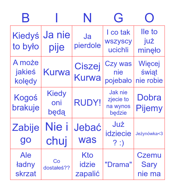 This bingo card has a free space and 24 words: Nie i chuj, Co dostałeś??, Ciszej Kurwa, Ale ładny skrzat, Ile to już minęło, Kiedyś to było, A może jakieś kolędy, Ja nie pije, Jak nie zjecie to na wynos będzie, Jebać was, Czy was nie pojebało, Kogoś brakuje, Już idziecie ? :), Jeżynówka<3, Kurwa, "Drama", Dobra Pijemy, Ja pierdole, Więcej świąt nie robie, Kiedy oni będą, Czemu Sary nie ma, Zabije go, I co tak wszyscy ucichli and Kto idzie zapalić.